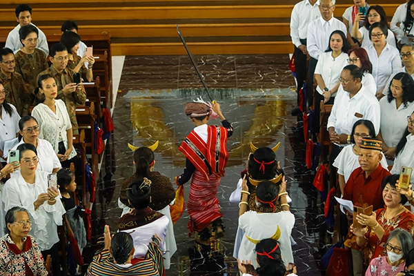 Selanjutnya lagu pembukaan dengan gaya Timor, Mari Masuk Rumah Tuhan, berkumandang. Sembilan penari dari Paguyuban Fobamorata, berpakaian kain tenun dari beberapa suku di Nusa Tenggara Timur, membuka jalannya perarakan petugas liturgi dengan Tarian Ja’i dan Toja Pala. Kepala para penari perempuan berhiaskan bulan sabit emas lambang cinta kasih Tuhan atas tanah air yang subur. Tarian ini berasal dari daerah Ngada Bajawa untuk menyambut tamu kehormatan. Seorang pemuda bergerak paling depan membawa pedang panjang. Lambang seorang ksatria yang menjaga dan melindungi para petugas liturgi dan penari yang diantarnya. Tarian ini dikoordinir oleh Dominggus Taolin dan Raymond Adja.